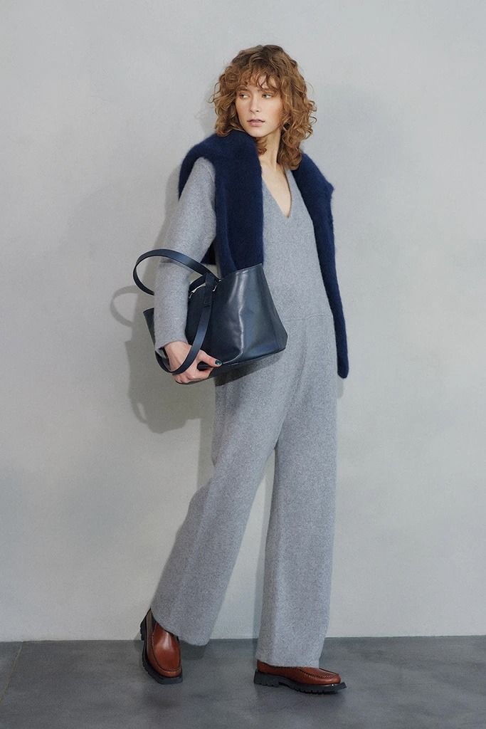 気負わず着られるストレートなニットオールインワンを、すがすがしいほど潔いVネックでセンシュアルに味つけ。ふわっと毛羽立つフォックス混のニットは、見た目まで心地いい。