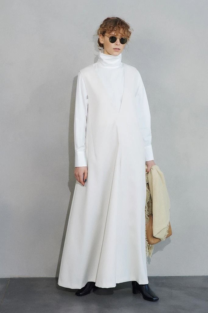 ドレスのようにダイナミックに広がるシルエット。白+幅広フォルムの膨張感をそぎ落とす切れ味の鋭いVネックデザイン。
