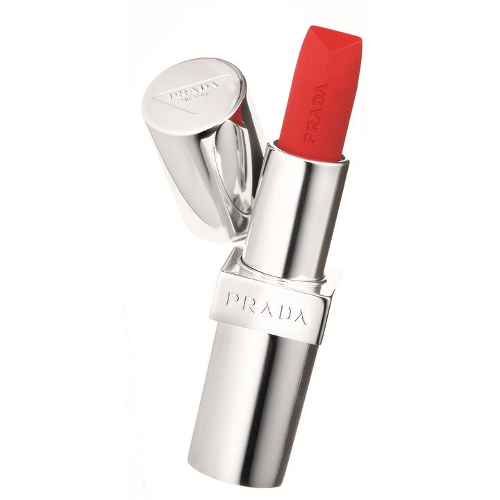 プラダの象徴的なナイロンを纏ったような上品な輝きのレッド。モノクローム ウェイトレス リップカラー(スムース ナイロン) R128 ¥6,930 ※3/20発売(プラダ ビューティ)