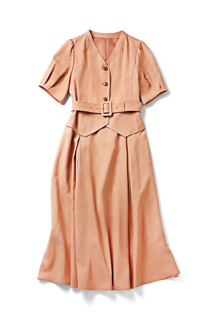 ジャケットレイヤードしたようなスタイリッシュなデザインで、ピンクワンピをきりりと引き締めて。