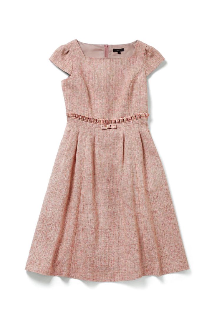 ウエストの切り替えやプチリボン、キャップスリーブがエレガント。さまざまな色の糸を織り交ぜた生地で一味違うピンクカラーに。