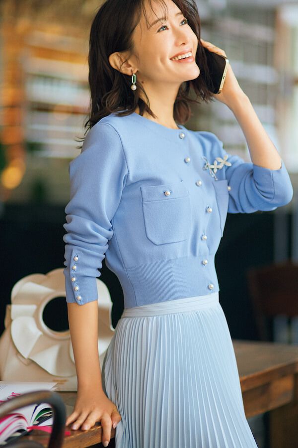 清涼感のあるブルーのワントーンで季節感と気品を意識。胸元に添えたブローチがキャッチーかつ華やかなポイントに。