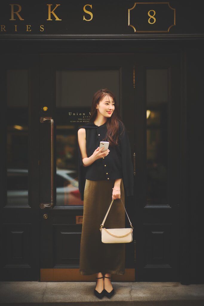 アプリで知り合った彼と初めて会う夜はモテを意識したコーデで。黒を重ねて大人っぽくまとめたトップスと、腰まわりから裾へすとんと落ちるツヤ感たっぷりのナロースカートが、いい女っぽさを盛り上げてくれます。ノースリーブトップス¥27,500(Theory)肩にかけたカーディガン¥6,990スカート¥9,990(ともにPLST)バッグ¥17,600(メゾン ヴァンサン/フラッパーズ)パンプス¥57,200(ネブローニ)ブレスレット¥12,100(ワンエーアールバイウノアエレ/ウノアエレ ジャパン)