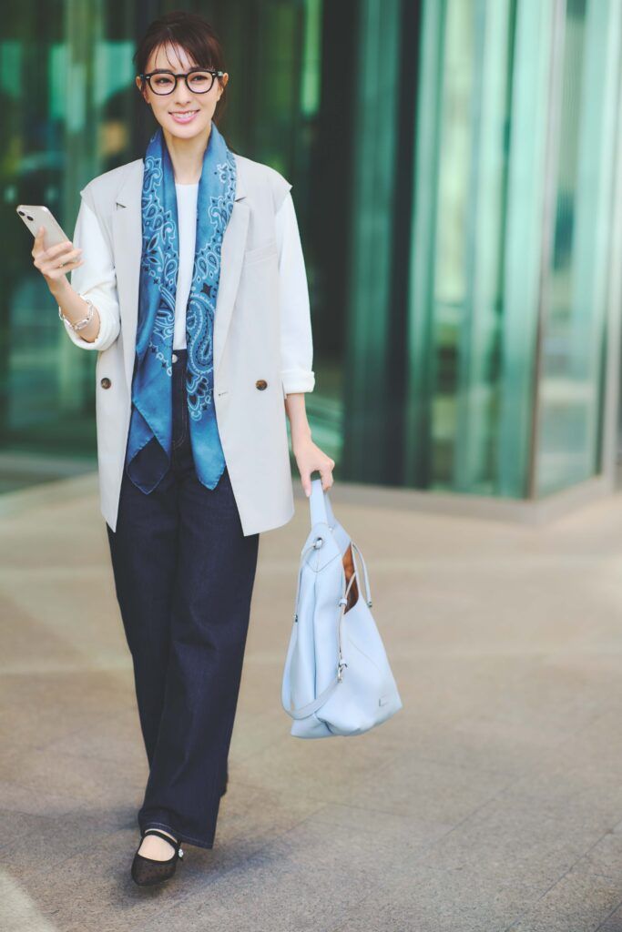 春から働くのは今までよりも服装ルールが緩めの部署。“オフィカジ”ってどの程度が正解!?と迷ったら、きちんと感とこなれを両立できるジレで初出勤を。襟元に鮮やかブルーのスカーフをサッと合わせたら、春らしさがぐんとアップします。ジレ¥17,000(PLST)ニット¥2,990デニムパンツ¥3,990(ともにUNIQLO)スカーフ¥24,200(マニプリ)バッグ¥75,900(ジャンニ キアリーニ/ジャンニ キアリーニ 銀座店)フラットシューズ¥16,500(ダイアナ/ダイアナ 銀座本店)メガネ¥44,000(アイヴァン/アイヴァン 東京ギャラリー)ブレスレット¥24,200(ワンエーアールバイウノアエレ/ウノアエレ ジャパン)