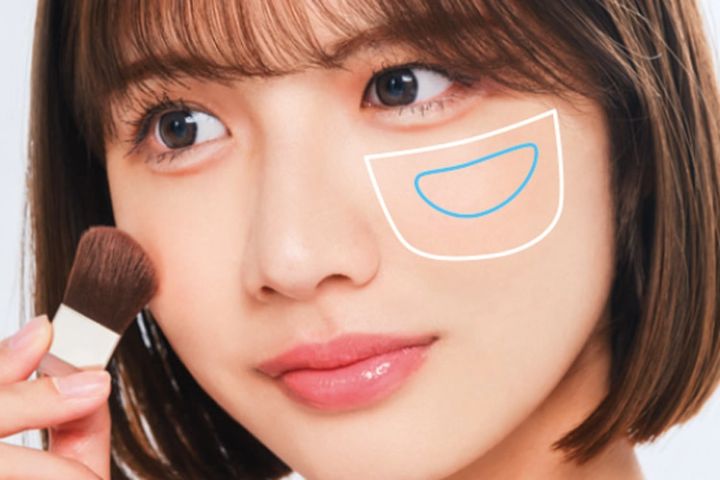 さらに立体感を出すため、青囲みで記したほおの高い位置に色を重ねて塗る。ここが1番濃くなるように好みで色を調整する。