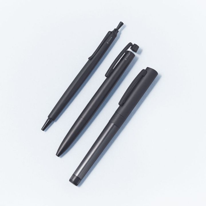 1986年から続くデザイン筆記具〈ズーム〉のリブランディングで登場した3種の文具。左からL2、C1、L1。C1とL2はシャープペンシル、油性ボールペン、L1は水性ゲルボールペンが揃う。「どれもスタイリッシュで惹かれましたが、ノック部分が浮いているように見えるC1は、どうなっているの!?と興味が湧きました。ジュラルミン素材の程よい重さが心地よく、安定感があって書き味もなめらか。そして、使って一番感動したのはL1。ペンが紙に触れた瞬間から気持ちよく色がのるんです。使いやすさが評判のL2のノック部分は『!』マークのようで、フォルムにもさりげない遊び心があって面白い」