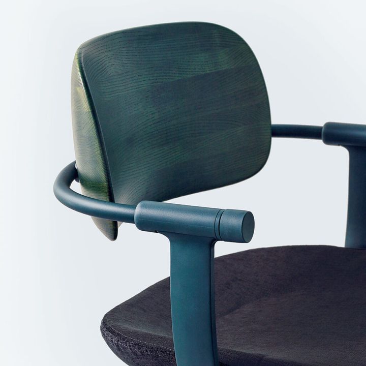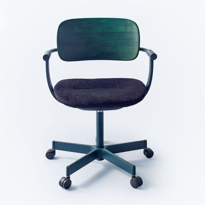 座面は写真のファブリックのほか、木目も選べる。木目はブラックなど全3色、ボディはペールオリーブほか4色。4本脚タイプもあり。「色の組み合わせを考えるのも楽しそう。肘掛けの先端を回転させると座面の上げ下げができて、直感的に使えるのも心地よい」。キャスター付き5本脚 W560×D515×H775〜890(SH425〜540)㎜ ¥143,330〜(イトーキ 0120−164177)