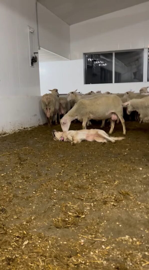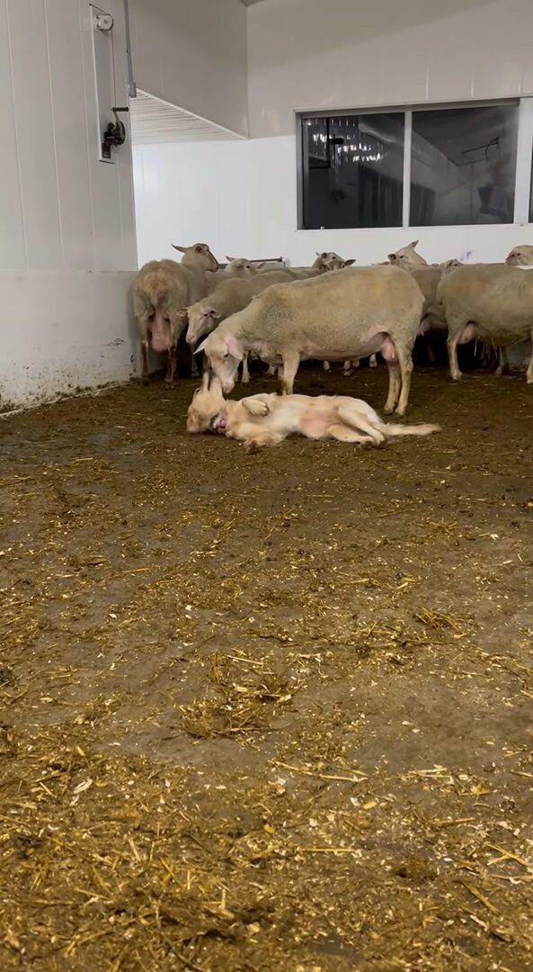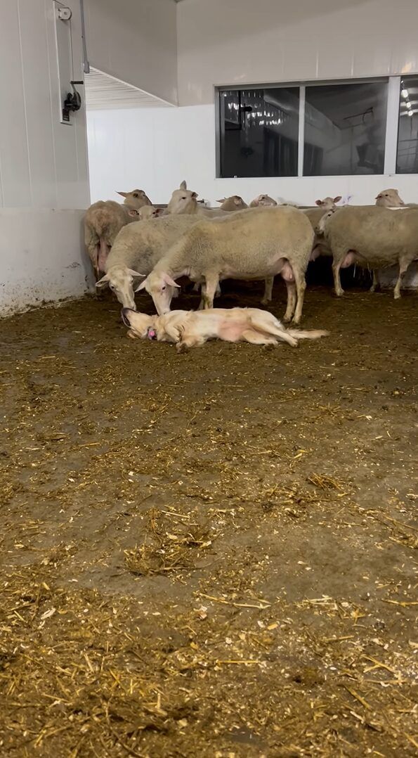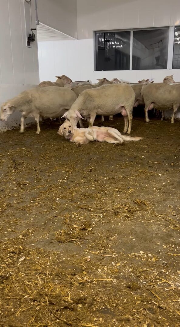 ヒツジたちがいる農場で、リラックスした様子を見せているのは愛犬の『レクシー』。 お腹を見せて寝転がっているこの子を、ヒツジがペロペロしてあげています。