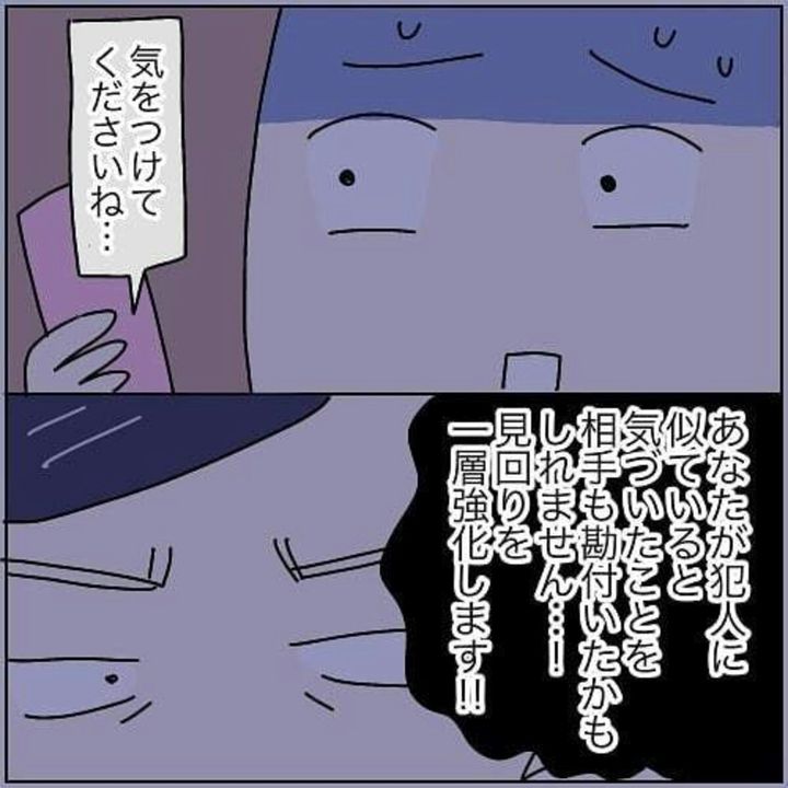 隣の住人が犯人かもしれないことに気づいた加藤かと(@kato_usausako)さん。すぐに警察に報告します。見回りを強化してくれるそうですが、隣の住民が犯人であるという証拠はありません。かとさんの体験談を漫画にした本当にあったちょっと怖い話』第22話をごらんください。(この漫画には女性を狙った犯罪の描写が含まれます。苦手な方はご注意ください)