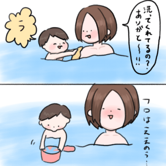 2歳の男の子みぃくんのお母ちゃんであるねむりひつじさんから、お風呂でのお話です。二人で湯船で温まっていると、手桶で遊んでいたみぃくんが・・・。