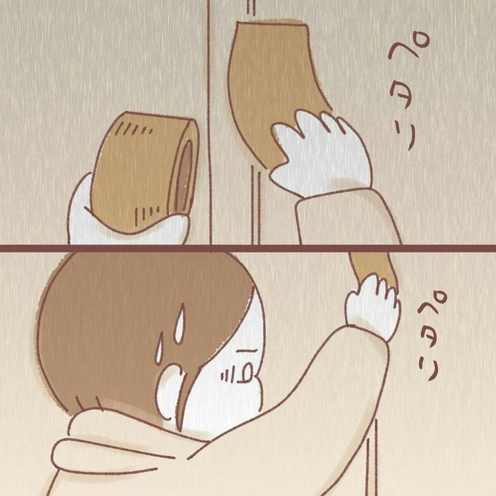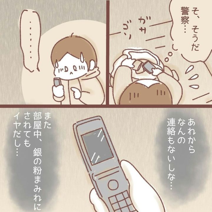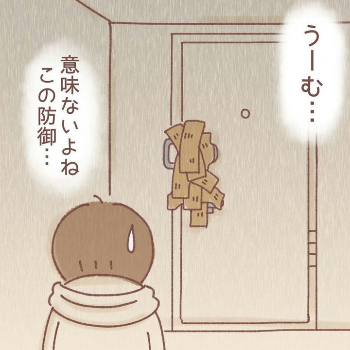 この作品は、紅ほっぺ(@beni_taihenne)さんが独身時代に体験した空き巣被害について描かれています。犯人と対面してしまった紅ほっぺさんは、恐怖のあまりパニックになります。ガムテープで玄関のドアを塞ぎ防御。しかしそれも、気休め程度にしかなりません。警察に連絡しようとしましたが、前回の空き巣事件で部屋中が銀の粉だらけになったのでためらっています。『泥棒に入られた』第12話をごらんください。