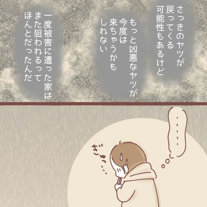 2週間後、紅ほっぺさんが深夜に帰宅し、用を足していると玄関からカチャカチャと物音が聞こえました。不審に思い玄関に向かうと、ピッキングに成功した空き巣と対面してしまいます。犯人の顔を見たことで、さらに恐怖心が増した紅ほっぺさん。2度目の被害の後は愛猫たちを連れて実家に避難。その後、マンションを退去しました。