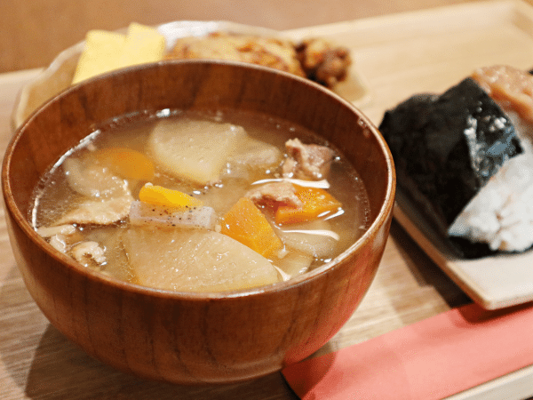 セットには、豚汁、だし巻き卵、大きい唐揚げがついています。 豚汁には具材がたっぷり、おにぎりには鉄板の汁ものですね。