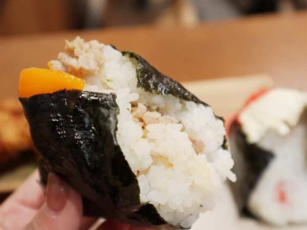 具材は隅までたっぷり、ふんわりにぎられているからほろっと食べられます。ほんのり感じる塩は、角のないあるまろやかな味。それをつつむ海苔は、熊本県有明海域産とのことでしっかりとした厚みがあり、海苔の風味と香りが感じられました。どの具材もごはんにあって本当においしい。