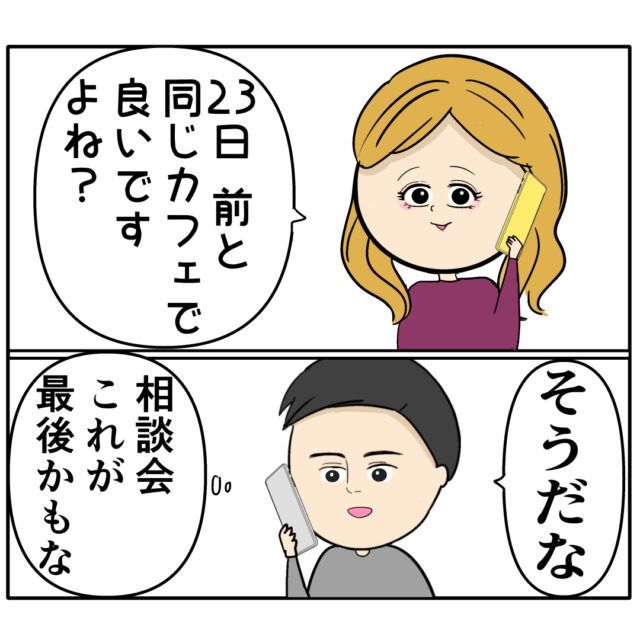 表向きにはふり子さんと彼氏が上手くいくよう応援する良し男さんですが、心の中ではふり子さんへの自分の気持ちを抑えるのに必死。しかし、もしも不倫してバレたら・・・と想像し、会社で人事処分や同僚からの信頼を失うことになるとリスクの大きさを考え、冷静になるのでした。そのとき、「外面さん」と電話からふり子さんの声が聞こえ・・・。