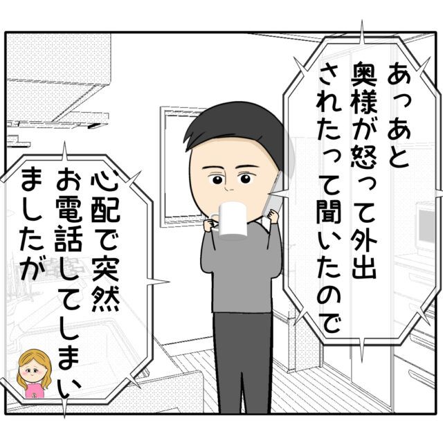 「あっあと、奥様が怒って外出されたって聞いたので心配で突然お電話してしまいましたが」