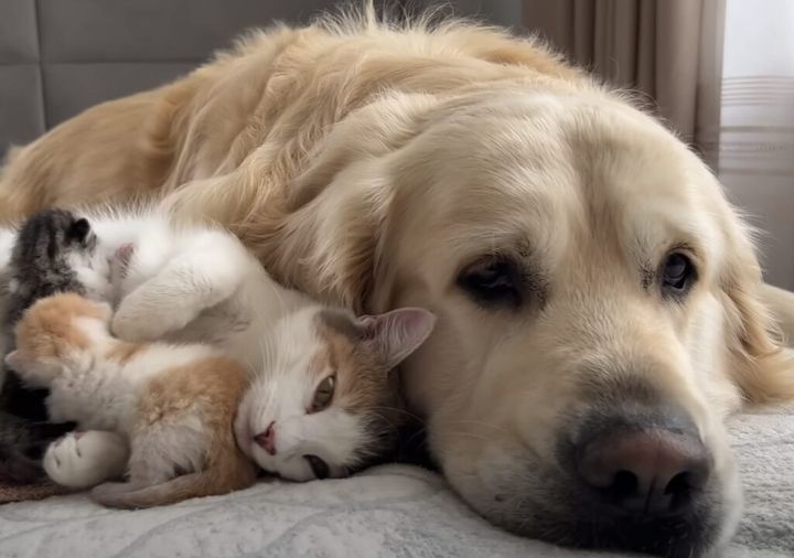 子猫の誕生を大喜びしている犬さん。すぐに子猫たちと親友に!