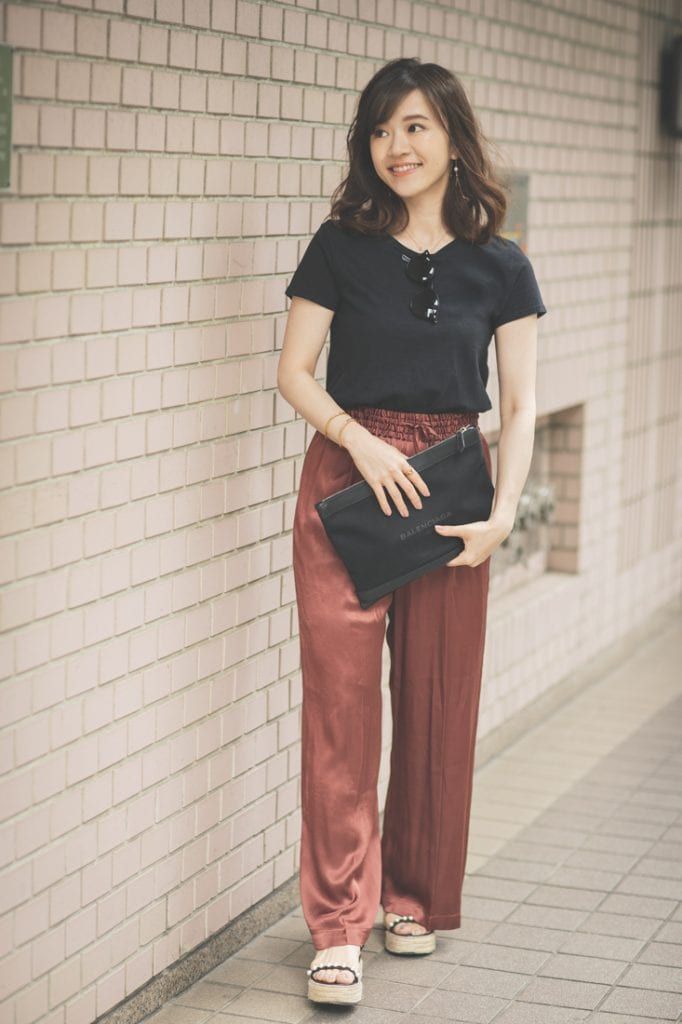カジュアル過ぎる服装をあまりしないのですが、黒Tシャツならシックな雰囲気だしキレイめにもモードに着こなせるのでこの夏ヘビロテしています。中でもプラザで約3千円で見つけたこの黒Tシャツはスカートやどんなボトムスにも合わせやすくてお気に入り。今日はサテンパンツでモードに着こなしました。(桶谷綾乃さん 30歳・自営業 161cm)