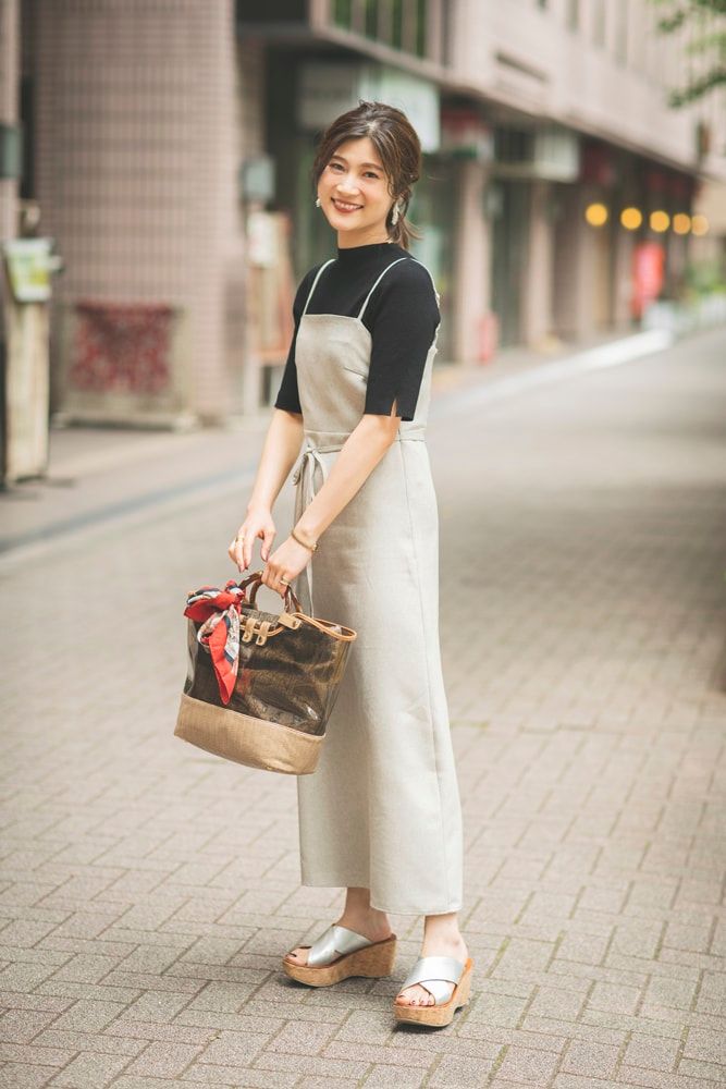 長め袖にスリットが入っていたり、首が詰まったデザインでエレガントなデザインがお気にいり。ワンピースと色のコントラストをつけることでさらにスタイルアップ狙います。大きめのPVCバッグやウェッジソールのボリュームサンダルでカジュアルダウンしました。(黒島秀佳さん 29歳・マスコミ関連161cm)