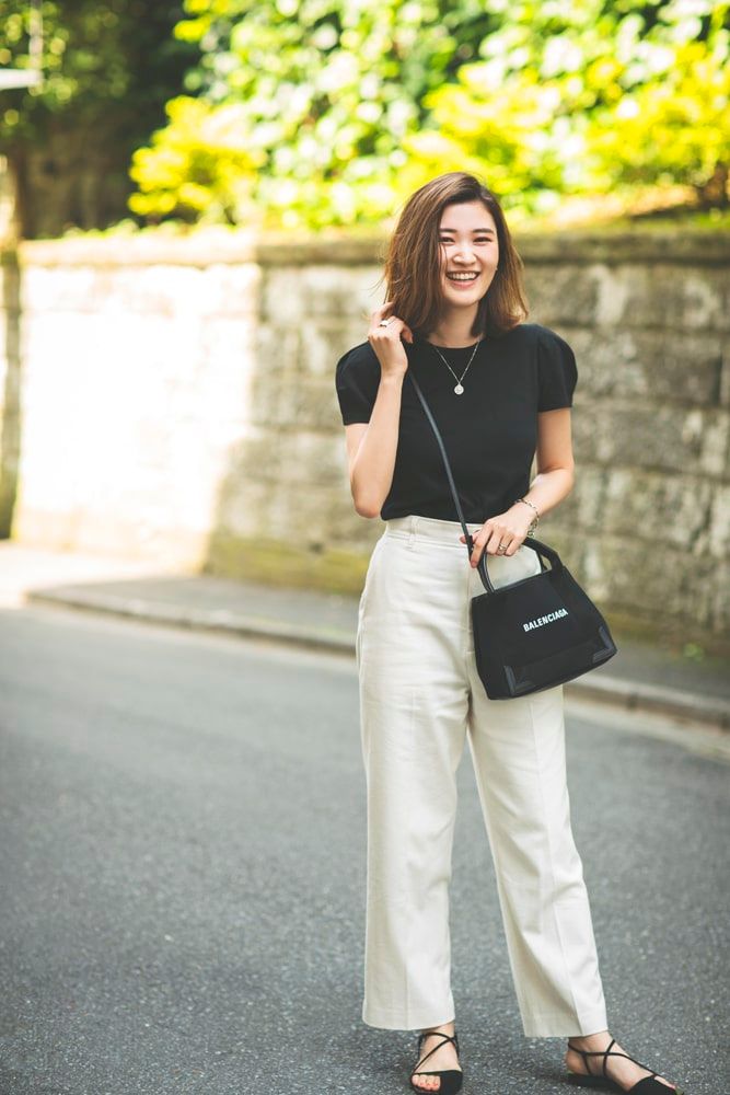 ZARAで千円代で見つけた黒Tシャツはパフスリーブと首つまりデザインでブラウス感覚で着られるうえ、シンプルなワイドパンツとのワンツーコーデもサマになります。黒小物でまとめつつ、ロングネックレスで顔周りに華やかさを添えました。(吉村 奏さん 27歳・自営業 165cm)