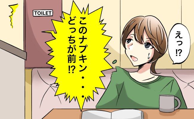 「ありがとう」とナプキンを持ってトイレに入った友だち。しばらくすると……トイレの中から「このナプキンどっちが前!?」と友人の声が。まさかの質問が飛んできたのです。