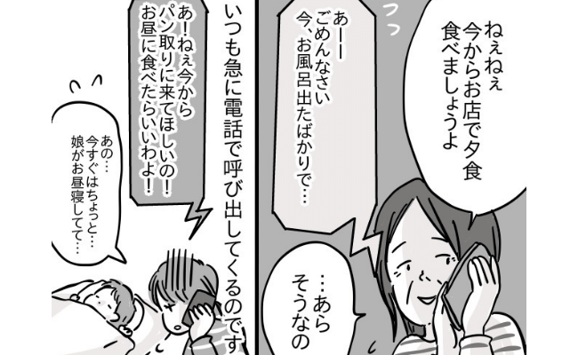 義母からの呼び出しは、いつも急なことが多かったです。内容は、娘がお昼寝中に「パンを渡したいから、家の近所まで来てほしい」や、娘とお風呂に入っているときに「今から近くのお店で夕食を食べましょう」といったお誘い、「今、近くのスーパーにいるからおいで」といった呼び出しなど。