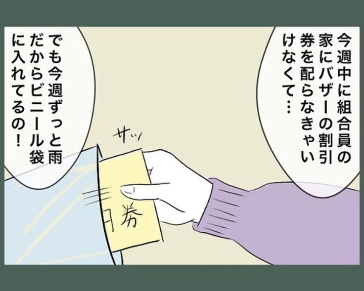 この物語は、翌年に出産を控えたマイ一家が、念願のマイホームに引っ越した直後に地域の組合長に任命され、手探り状態で組合長の仕事をすることになった、作者・みぃ子(@miico_no_kurashi)さんの実体験を元にしたお話です。組合長の初仕事を終えた直後、翌週のバザーで使用する割引券の配布を任されたマイ。今週中に配らなければならないものの、雨続きのため、1枚ずつビニール袋で梱包します。殺気立つマイに、夫も思わずひるんだようです。『引っ越し直後に組合長を押し付けられた!』第11話をごらんください。