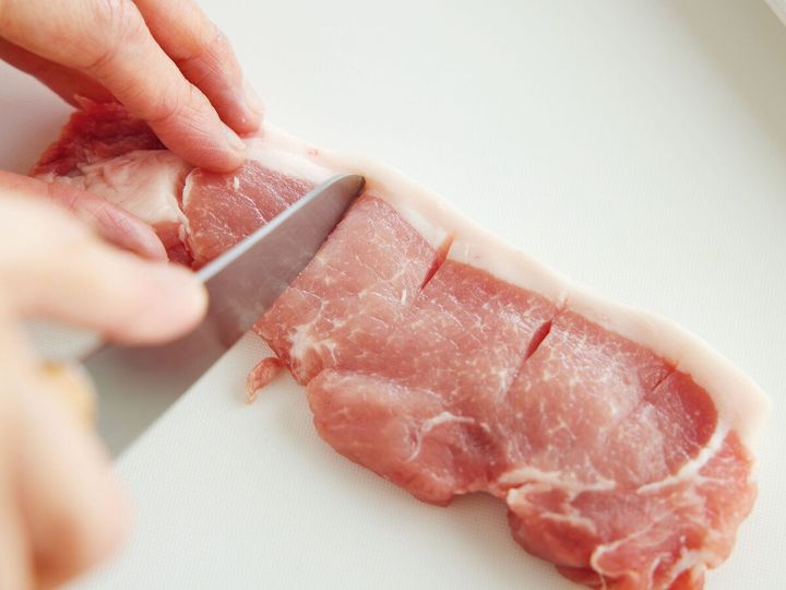 豚肉は筋切りをしておくと焼いてもそり返らず、全体が香ばしく焼き上がります。刃先がまな板に触れるくらいまで深く刺してOKです。