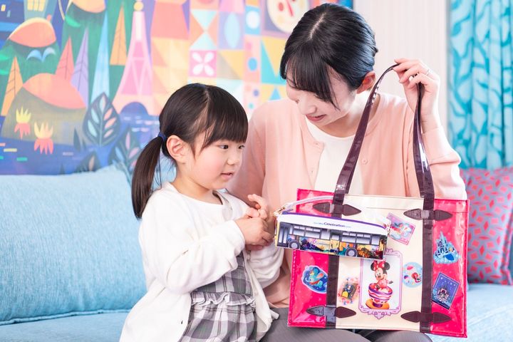 オリジナルトートバッグには、ホテルとパークの間を運行し、宿泊のゲストに親しまれているシャトルバス「ウィッシュ&ディスカバー・シャトル」をデザインしたオリジナルポーチが付いています。オリジナルポーチはトートバッグに付けてもOK。