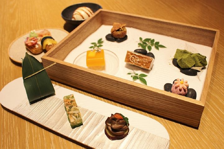 メインの木箱にはスイーツが5種配置されています。枯山水に見立てた盛り付けが日本らしい雰囲気を感じさせます。この木箱やスイーツの下に添えられた石など、「和のアフタヌーンティー」ならではの、画になる盛り付け。