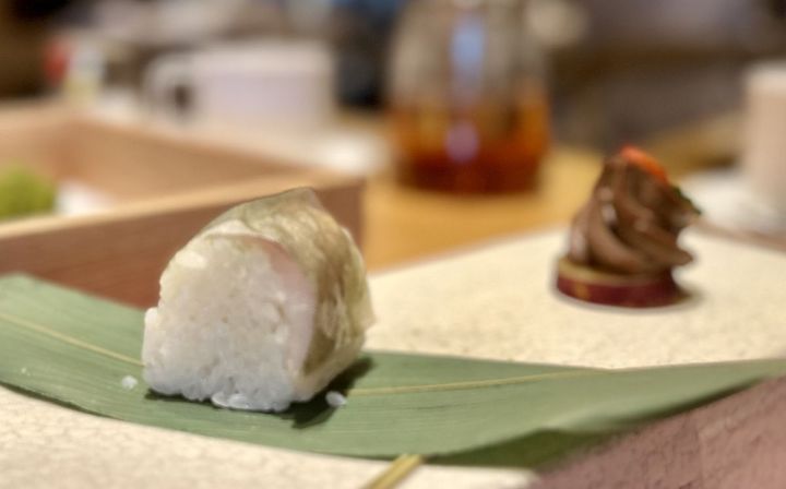 「桜海老の翡翠寄せ」はさっぱり、「小鯛の笹巻き寿司」は酸味があり、甘いスイーツの間の箸休めにもぴったりです。