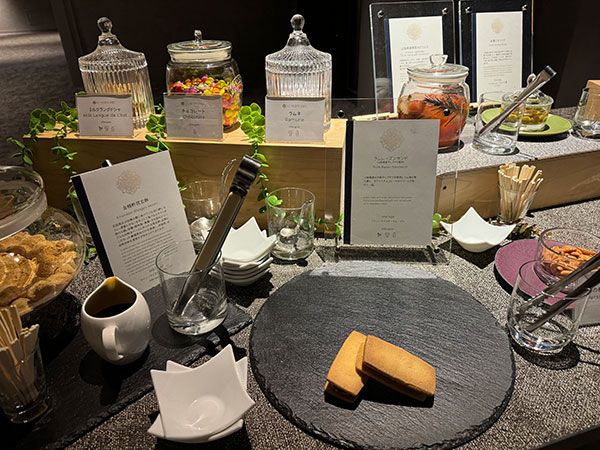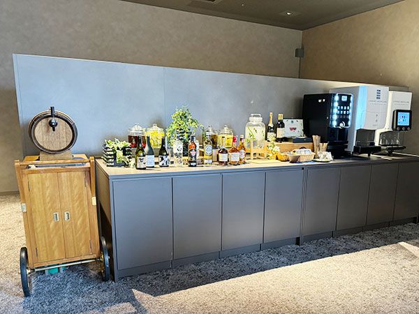 吹き抜けが開放的で気持ちいいラウンジでは、時間によってお酒やコーヒー・紅茶のドリンクと、軽食をいただくことができます。