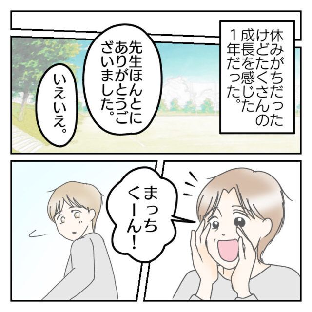 担任の先生の言葉から、まっちくんのことをとてもよく見ていてくれたことが伝わってきますね。2年生になったまっちくん、今度の担任の先生はどんな先生なのでしょうか?