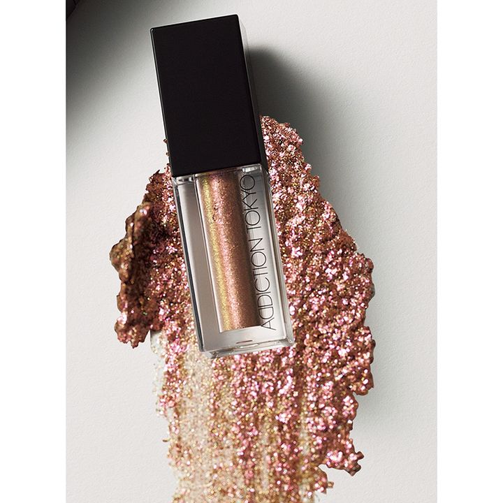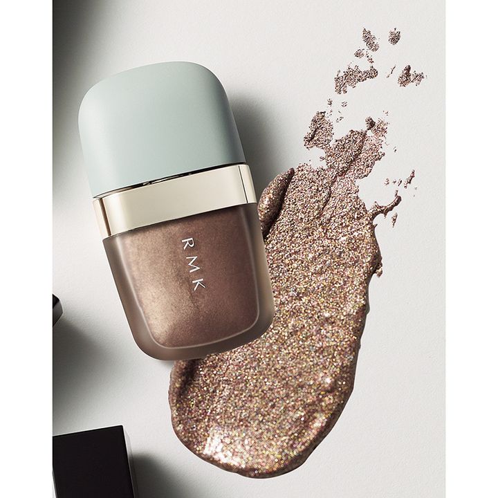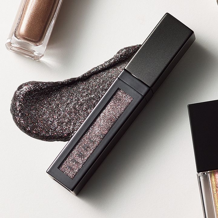 素肌を透かしつつ薄膜のようにぴたっと密着するリキッドシャドウは、華やかなラメでも今どきな軽さをキープ。リップはリキッドの質感とリンクさせて、ツヤっぽいローズカラーを。チークはブラウン寄りのベージュを小鼻に向かって広めにON。