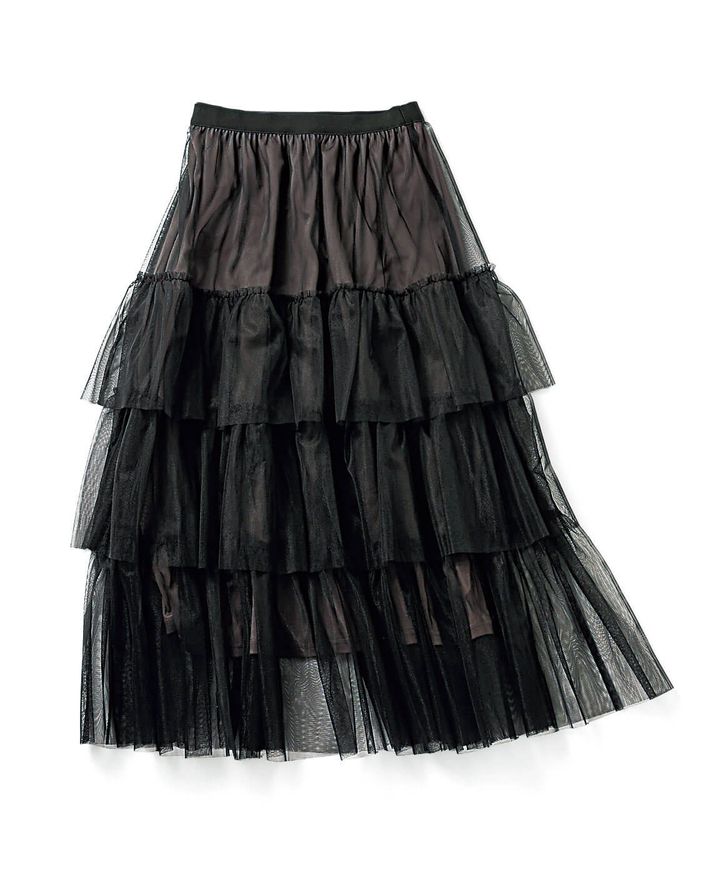 ラッフル状になったボリューム満点のチュールでゴージャス&フェミニンに。重たく見えがちなブラックもシアー素材なら軽やかにきまります♪