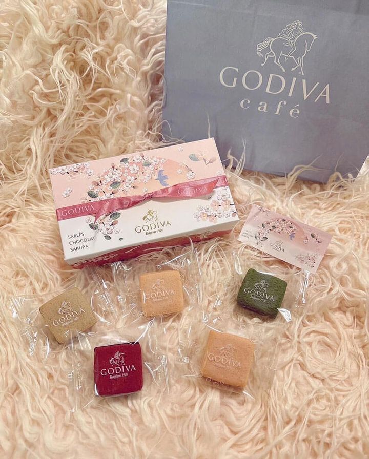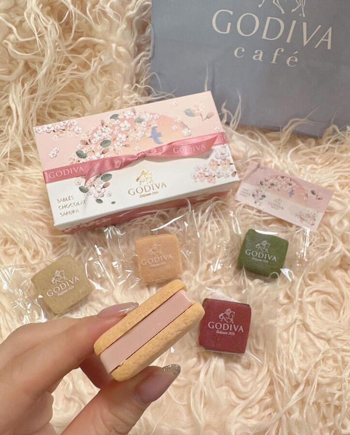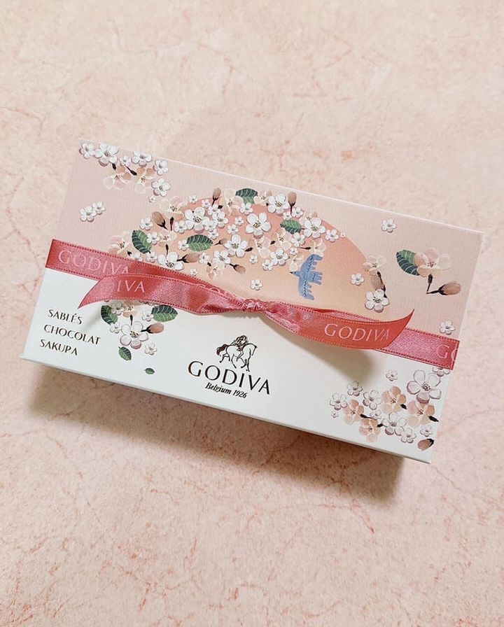 ゴディバの「サブレショコラ 桜」です! 箱のデザインが可愛いくて、サブレもとってもおいしいので、お花と一緒にプレゼントしたら可愛いなぁと♡