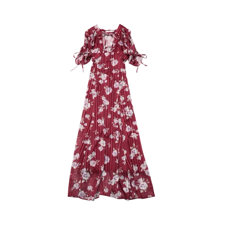 落ち着いた赤が大人可愛いワンピ。大きな花柄が印象的。