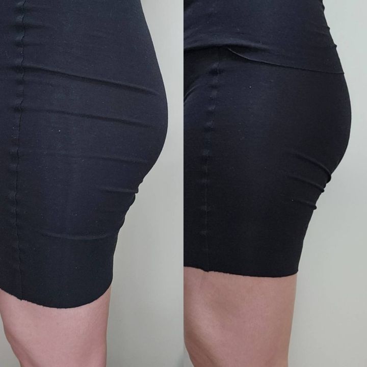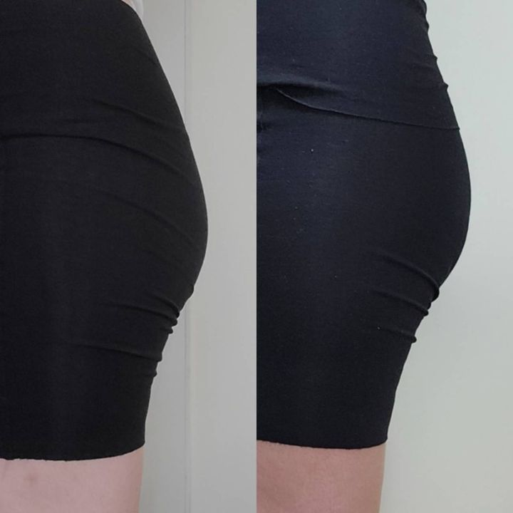 ちょっと、小さくなってきているんです……! これは服を着ていても実感あり。ぐいっとお尻が上がるのかと想像していたのですが、でろーんと広がった肉が、集まろうとしている気がします。これはきっと筋肉がつくことにより、その方その方のお尻の課題によって結果は異なるのではないかと想像します。お尻がぺたーんとしている方は筋肉がついてお尻が出現するのかもしれませんし、私のようにそもそも肉が多過ぎると小さくなるのかもしれません。どちらにせよ、大臀筋が鍛えられることによってお尻に気合が入ることは期待できそうです。そもそも約10カ月、お風呂で使う尻トレ機器を愛用しまくっていたから、太めながらもお尻の調子は、悪くないと思っていました。46歳、尿漏れなんて無縁の、キレのいい生活送ってます。なんだけど、やっぱりアレだけ痛かっただけはあって、ちょーっと尻が小さくなってるんです、当社比で。ついでに尻トレに目覚める前の、2023年5月のお尻と比べてみましょう。