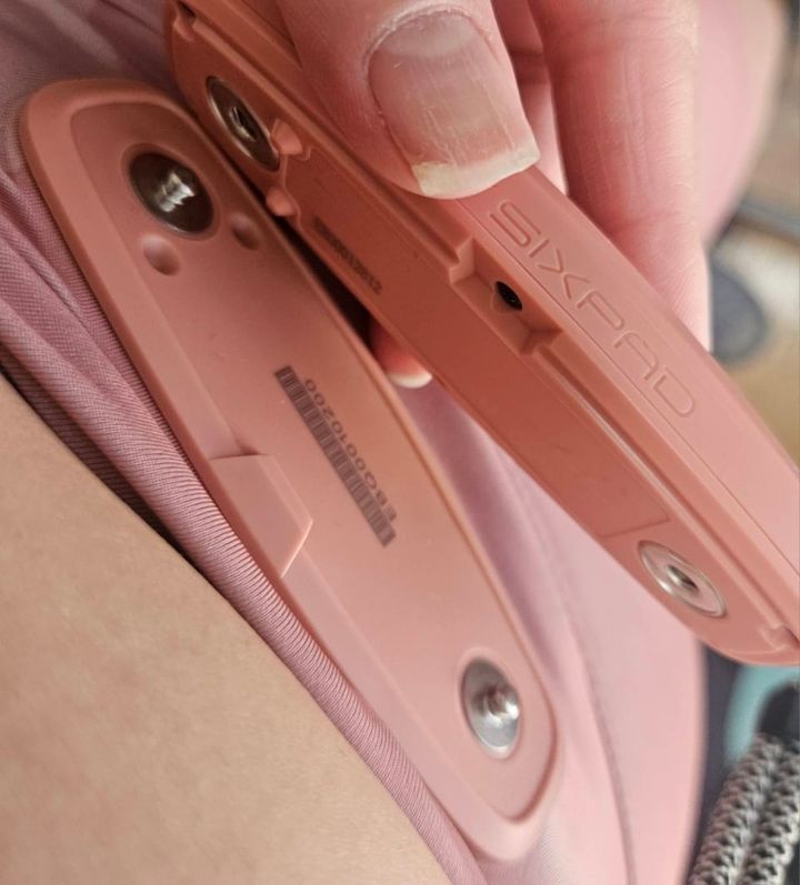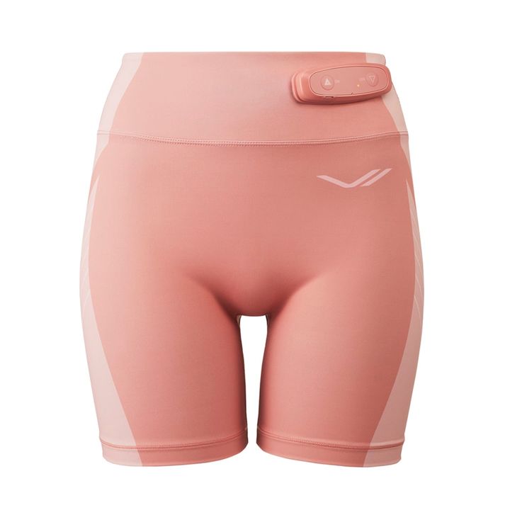 これ、要するにピンク色のスパッツのお尻のところに黒いシート状の電極がありまして、使用時はこの電極を湿らせておき、はいて、左腹部に充電したピンク色のスイッチをボタンでポチっとくっつけてONボタンを押すだけ。ONボタンはレベルボタンでもあるので、押したら押しただけレベルアップします。レベルは1~20まで。