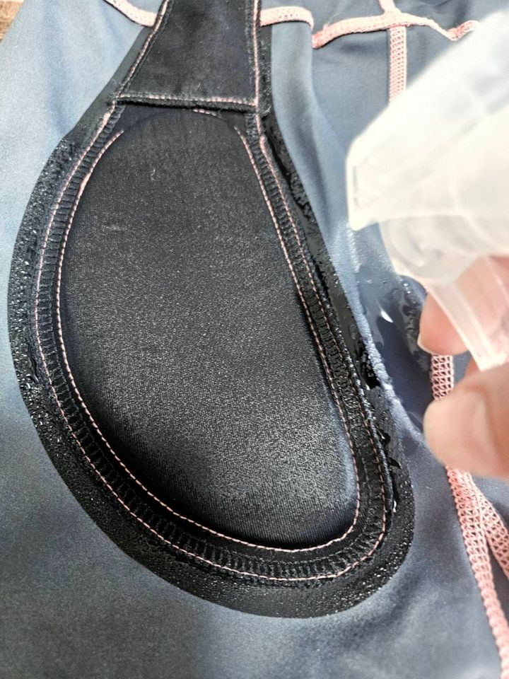 シュッシュシュー! 片方のお尻につきだいたい10~15プッシュくらい霧吹きしてそこそこしっかり湿らせます。はいて23分、お尻がぶるんぶるんしております。