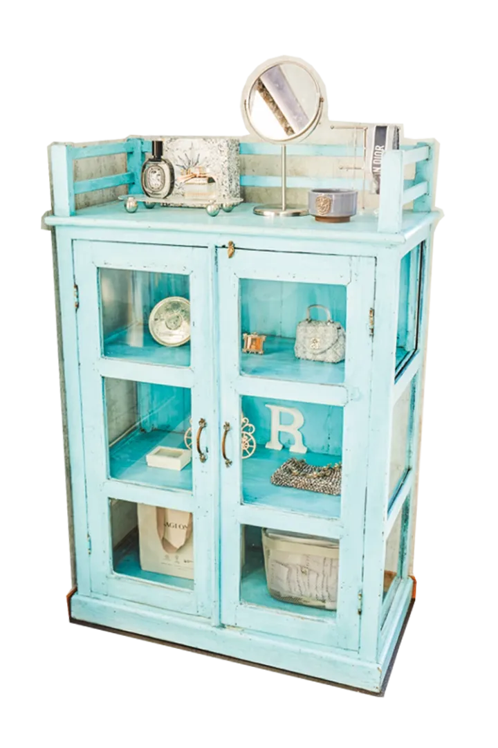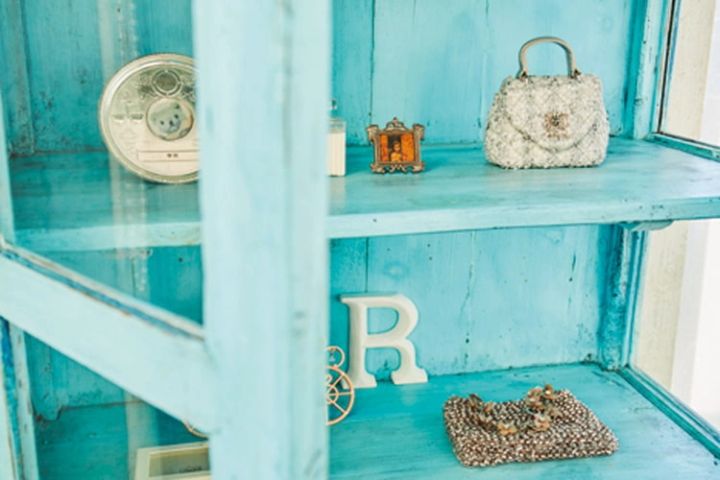 ティファニーブルーがおしゃれな棚は、昔のものだけど今もお気に入り。収納として使わず、ディスプレイにしています。