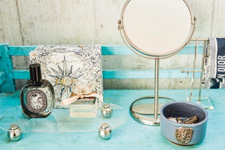 香水を並べたり、Diorが好きなのでDiorの小物を置いています。アクセはゴールドよりはシルバーのほうが多め。