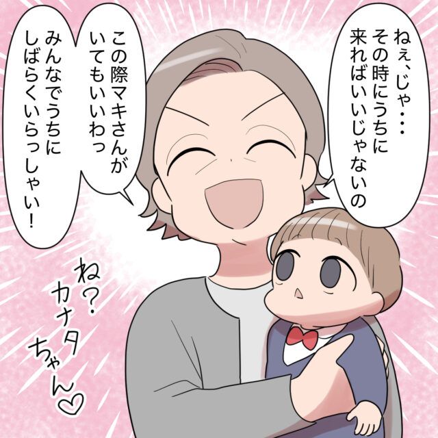 ハルタくんにミルクを飲ませて満足気な義母、そこにやって来たカナタくんに向かって「カナタちゃんもばぁばがいいの!?」うれしそう。そして「2人ともばぁばがいいのよ。今日からうちに泊まればいいわ!」と勝ち誇ったように言うも、「いや泊まらない」とカナタくんもゆうさんも離れてしまい、「今日の主役は私よ!?」と勘違いする義母・・