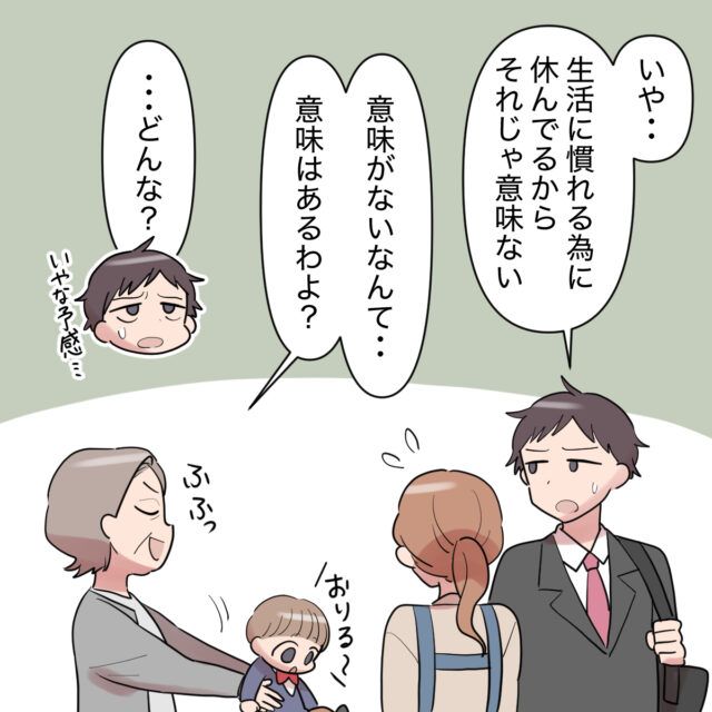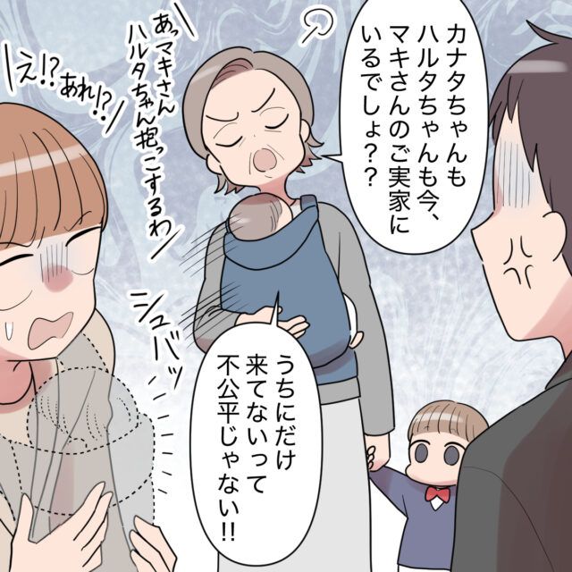 お宮参りが終わったにも関わらず、ハルタくんの抱っこをやめない義母、義父に叱られ渋々ハルタくんを手放すもあきらめられず、ゆうさんが育休を取ると聞きつけて「この際マキさんがいてもいいわ!みんなでうちに来ればいいじゃないの!」と言い出して・・(汗)