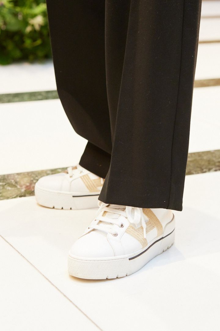 「スタイルアップも叶いつつ、走れる厚底のスニーカーは子育て中も重宝!雨のお出かけでベビーカー&傘を持つ日は特に愛用しています。このスニーカーは汚れてもすぐ拭き取れる素材なので、天気を問わず◎。さりげないHのロゴでリッチ感を後押ししてくれて、中がムートンで足元が暖かい、履きやすい、といいことずくしの一足です」大平 遥さん・158㎝(36歳/1歳の男の子と3歳の女の子ママ)