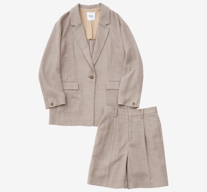 洗練された雰囲気とリラックス感を兼ね備えた、〈サロン アダム エ ロペ〉のジャケットとショートパンツ。リネンのようなナチュラルな風合いに仕上げた再生ポリエステル生地は、シワになりにくくお手入れも簡単。セットアップで揃えてもかっちりしすぎず、ラフに着られるのがいい。色違いでブラックもあり。