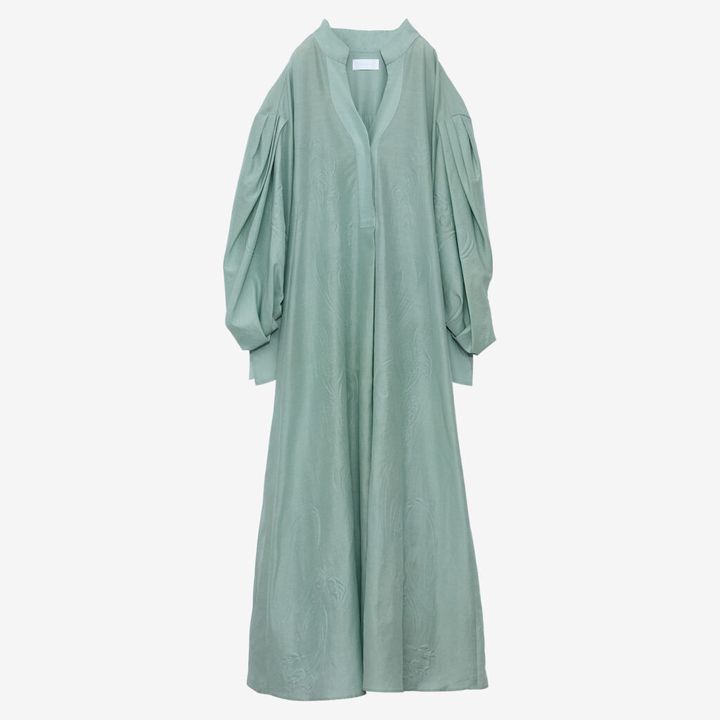 〈マメ クロゴウチ〉の2024年春夏コレクションで目を引いた、涼やかなミントグリーンのワンピース。光沢のあるシルクコットン生地を贅沢に使用し、袖は巧みなタック使いにより立体的なシルエットに仕上げている。17世紀の初期伊万里に用いられていた装飾技法”陽刻”から着想を得た、エンボス加工で表現した草花柄も印象的。