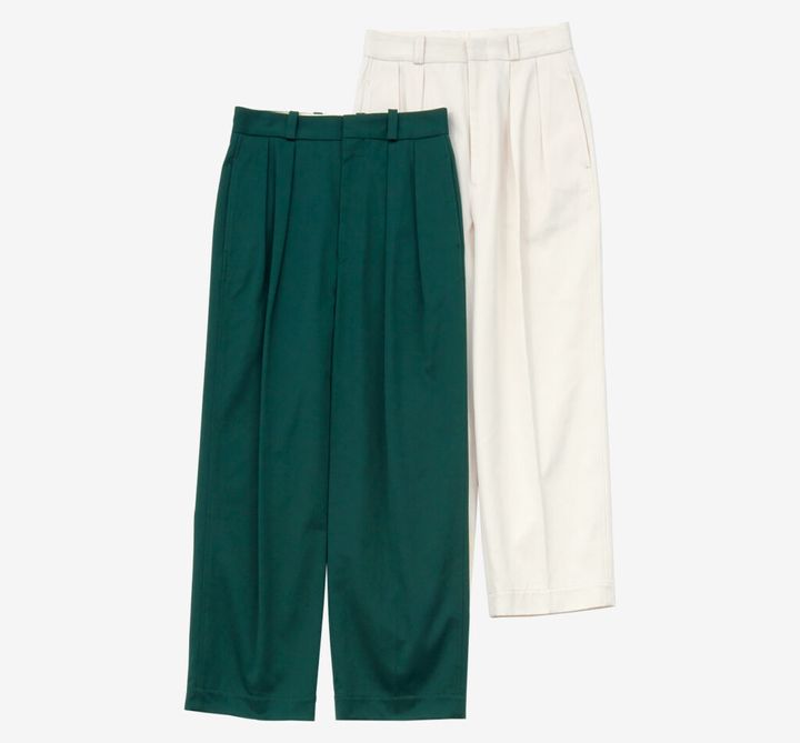 日々の定番になりそうなチノパンツは〈ナナミカ〉から。深めのタックとセンタープレスが入った端正な仕立てで、体のラインを拾わず、カジュアルにもシックにも着られるのが嬉しい。再生ポリエステルをオーガニックコットンで覆ったオリジナルの生地を使用。柔らかな肌触りと、耐久性や乾きやすさといった機能性を両立させ、着心地も抜群。