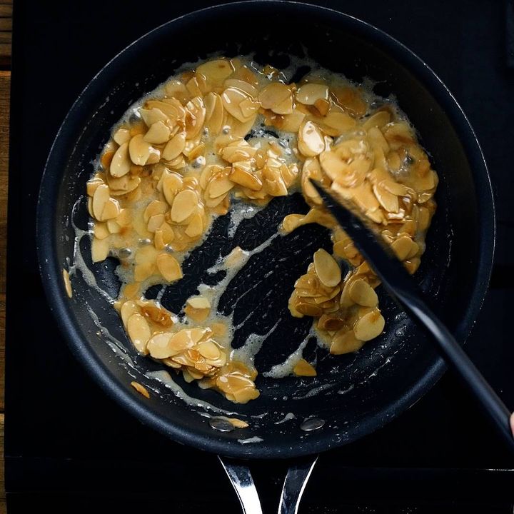 2: アーモンドスライスがきつね色になったら、 (a) を加え、全体が絡むように混ぜ合わせます。