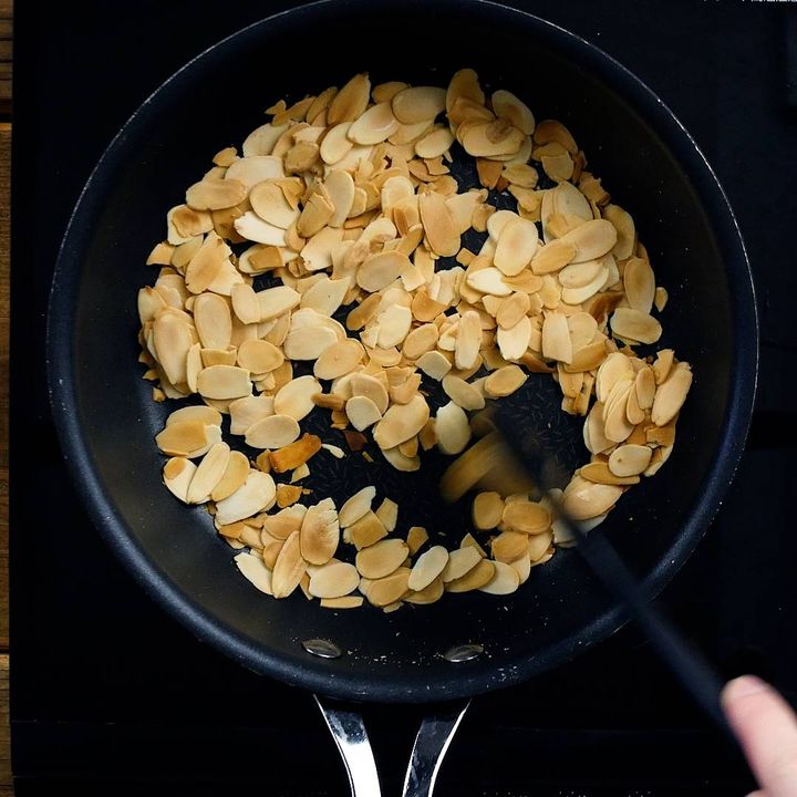 アーモンドが焦げないよう、やさしくかき混ぜながら炒ってください。オーブンを使用してもOKです。